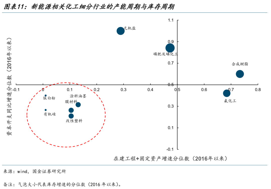 而结合相关行业最新的三季报行业所处的产能周期与库存周期情况来看,我们建议关注钛白粉、有机硅、涂料油墨、改性塑料与膜材料,相关板块未来新增产能相对有限,当当前库存周期也处于底部。当其传统业务景气度底部复苏,而新能源业务提供增量与重估空间,未来可能是行情扩散的重要方向。