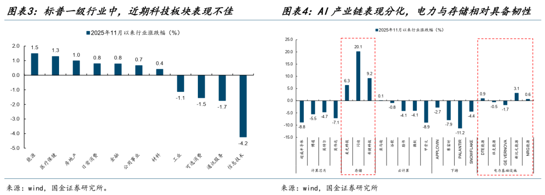 近期海外大型科技股表现不佳,除了美国货币市场利率快速上行对投资者风险偏好形成部分扰动外,市场对于OpenAI的“AI需要美国政府背书”的发言(尽管后续澄清并未寻求政府为其基础设施承诺提供担保)以及美联储相对偏鹰的降息表态反应较为剧烈,表明当前市场已经开始对AI科技巨头间的金融循环与预期过高风险产生警觉,激进的资本开支与巨头企业之间密集的大单签订已经不再是市场关注的重点,而是愈发关注于其AI业务本身的创收/创现能力能否覆盖其对于未来的支出承诺,以及良性的持续增长能力,并开始聚焦于更具确定性的板块(如存储、电力等)。