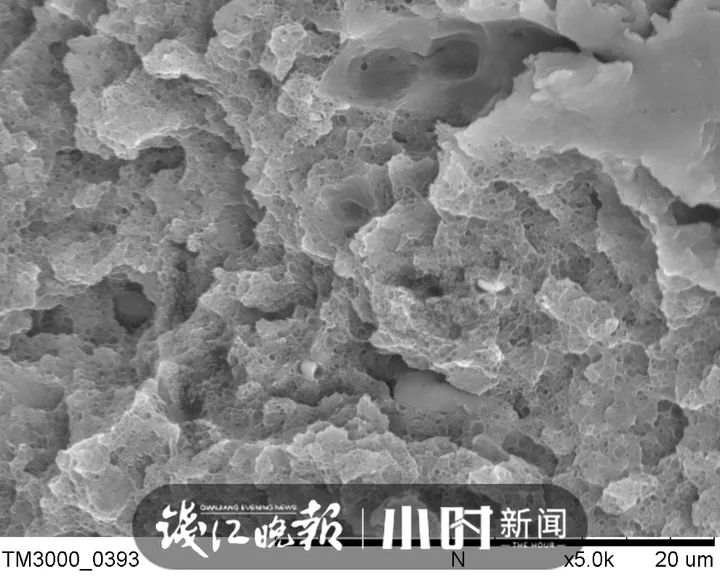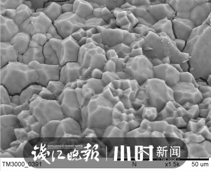 这是记者在浙江省农业科学院公共实验室,用扫描电子显微镜拍摄的大米淀粉结构,也就是放大一万倍后大米的样子。